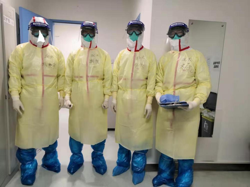 圖為北京大學(xué)第一醫(yī)院援湖北醫(yī)療隊李海潮與同事在武漢工作中合影。