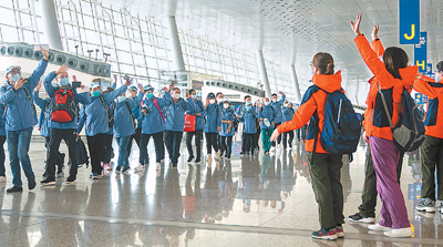 3月17日,在武漢天河機場,山東國家緊急醫(yī)學(xué)救援隊隊員(左側(cè))向江蘇國家緊急醫(yī)學(xué)救援隊隊員揮手致意。新華社記者 熊琦攝