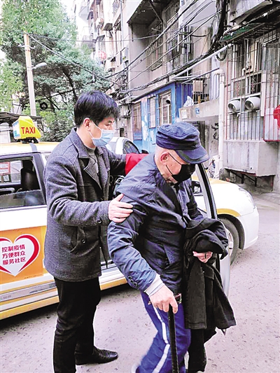 夏志剛(左)送高齡老人回家。光明圖片