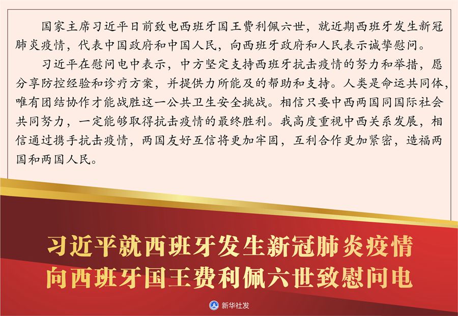 習(xí)近平在慰問電中表示,中方堅定支持西班牙抗擊疫情的努力和舉措,愿分享防控經(jīng)驗(yàn)和診療方案,并提供力所能及的幫助和支持。人類是命運(yùn)共同體,唯有團(tuán)結(jié)協(xié)作才能戰(zhàn)勝這一公共衛(wèi)生安全挑戰(zhàn)。相信只要中西兩國同國際社會共同努力,一定能夠取得抗擊疫情的最終勝利。我高度重視中西關(guān)系發(fā)展,相信通過攜手抗擊疫情,兩國友好互信將更加牢固,互利合作更加緊密,造福兩國和兩國人民。