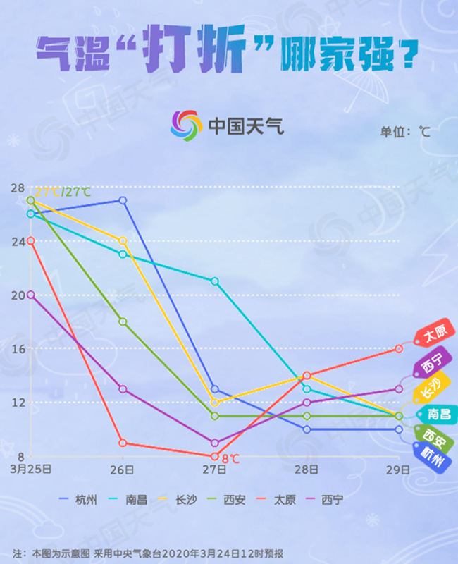 27日,南方大部也將加入降溫的行列,單日降溫幅度沒有北方劇烈,在6-8℃左右,但是累積降溫幅度大,27日開始的兩三天內,部分地區(qū)也將超過10℃。城市中,杭州最高氣溫累計降幅可達17℃、南昌降16℃、長沙降15℃、貴陽降14℃、上海降13℃,最高氣溫紛紛降至10℃出頭。29日,江淮、江漢和江南大部最低氣溫也僅有4~9℃。