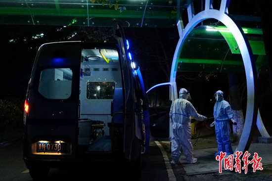 一位發(fā)熱病人被救護(hù)車送進(jìn)金銀潭醫(yī)院,司機(jī)對(duì)隨行人員進(jìn)行消殺。