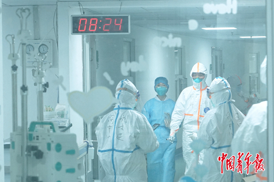 金銀潭醫(yī)院北三樓,上海醫(yī)療隊(duì)正在進(jìn)行交接班。