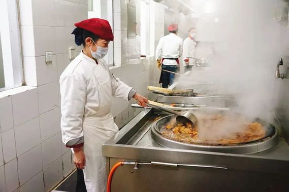 伙食團的師傅們凌晨4時進入后廚,一直要忙到晚上八九點。從準(zhǔn)備食材、煎炒烹炸,到整理餐具、收拾擺臺;從面食米飯、果蔬葷素,到保證菜品豐富多樣,餐餐可口……每天要接待1000多人次分7批次就餐,確保調(diào)度員隨時吃上熱乎乎的飯菜。