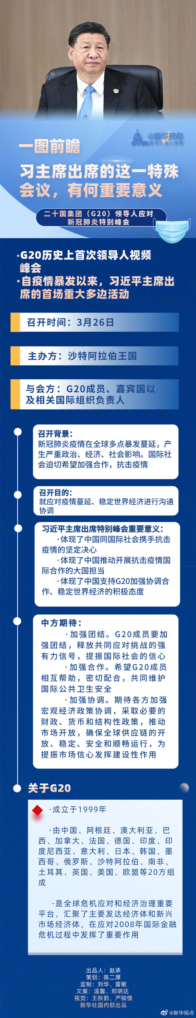 國家主席習近平將于3月26日出席二十國集團領(lǐng)導(dǎo)人應(yīng)對新冠肺炎特別峰會,此次峰會將以視頻的方式舉行。習近平主席出席此次特別峰會有什么重要意義?