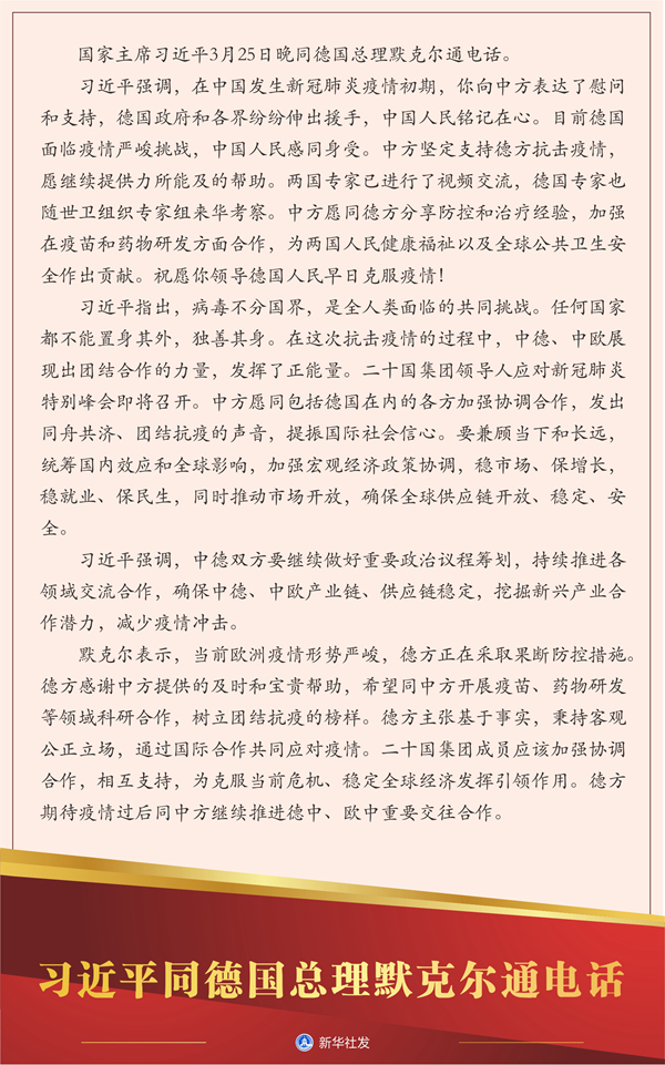 新華社北京3月25日電 國(guó)家主席習(xí)近平25日晚同德國(guó)總理默克爾通電話。