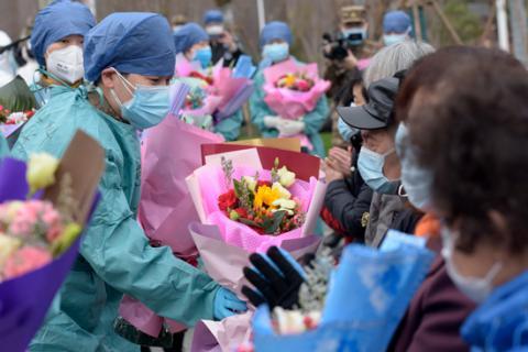 醫(yī)護(hù)人員祝福患者出院。范顯海/攝