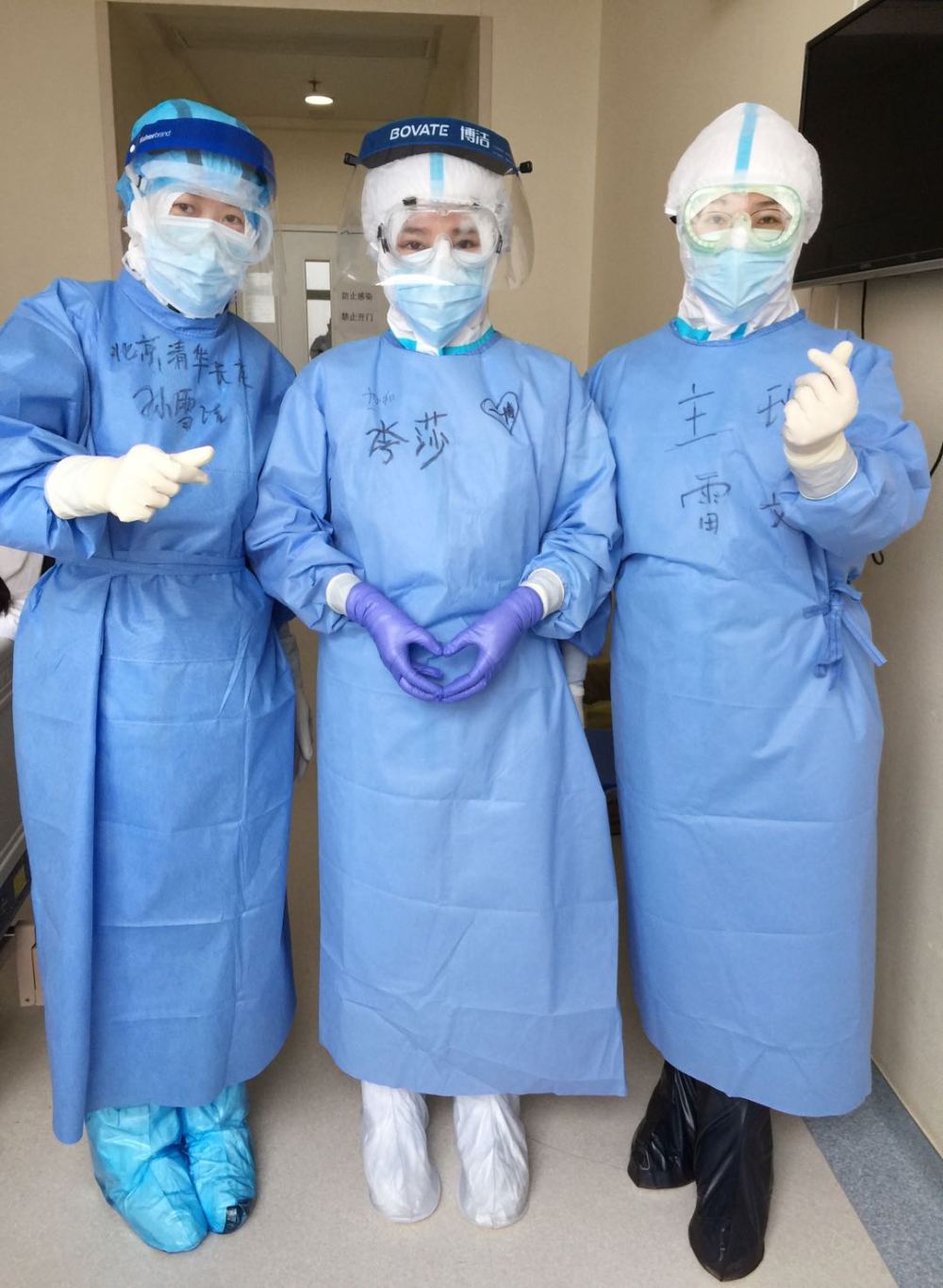 我想了想,有點開玩笑地說:“家人現(xiàn)在都很平安,唯一的心愿是可以見到我最喜歡的偶像王一博。”然后同事們就起哄說要錄下來,并在我的防護服上寫了四個大字“一博等我”。