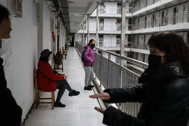3月27日,武漢軟件工程職業(yè)學院康復驛站,幾名結束康復隔離的觀察者在等待乘車離開。他們被送至集中樞紐點后,由社區(qū)派車接至家中。中青報·中青網記者 趙迪/攝