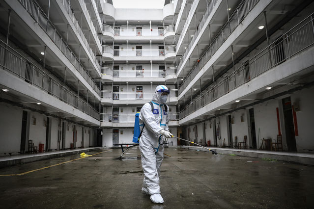3月27日,武漢軟件工程職業(yè)學院康復驛站,工作人員在進行消殺。中青報·中青網記者 趙迪/攝