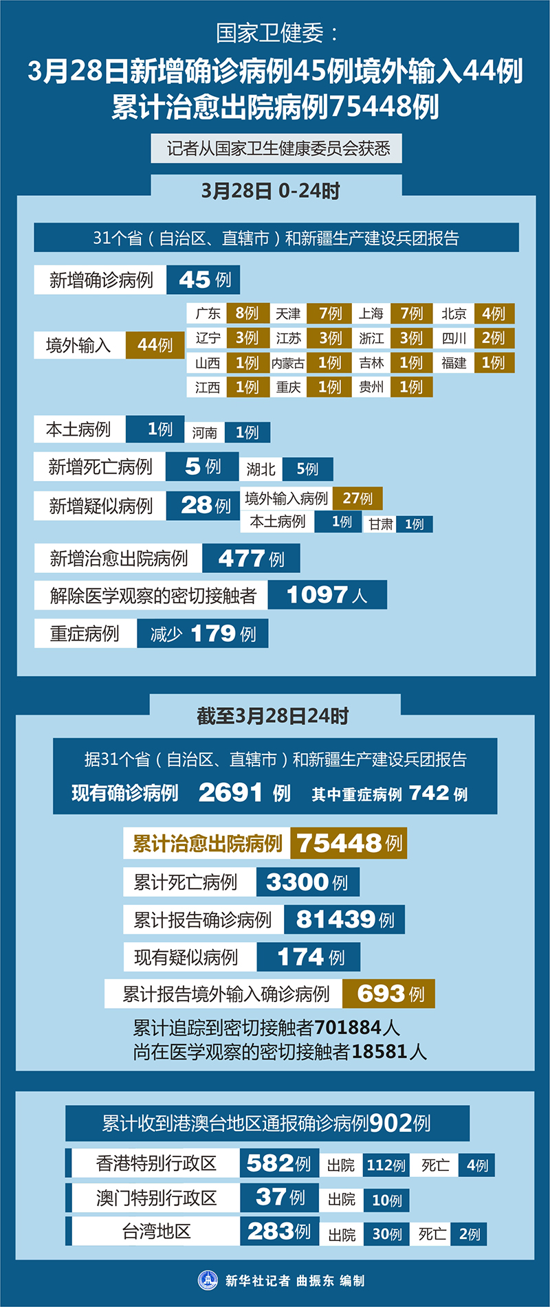 新華社北京3月29日電(記者陳煒偉、陳聰)記者29日從國家衛(wèi)生健康委員會獲悉,3月28日0—24時,31個?。ㄗ灾螀^(qū)、直轄市)和新疆生產(chǎn)建設(shè)兵團(tuán)報告新增確診病例45例,其中境外輸入病例44例,本土病例1例(河南1例);新增死亡病例5例(湖北5例);新增疑似病例28例,其中境外輸入病例27例,本土病例1例(甘肅1例)。