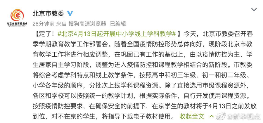 今天,北京市教委召開(kāi)春季學(xué)期教育教學(xué)工作部署會(huì)。隨著全國(guó)疫情防控形勢(shì)總體向好,現(xiàn)階段北京市教育教學(xué)工作將進(jìn)行相應(yīng)調(diào)整,在鞏固已有工作的基礎(chǔ)上,由以疫情防控為主、學(xué)生居家自主學(xué)習(xí)階段,調(diào)整為進(jìn)入疫情防控和課程教學(xué)相結(jié)合的新階段。市教委將綜合考慮學(xué)科特點(diǎn)和線上教學(xué)條件,按照高中和初三年級(jí)、初一和初二年級(jí)、小學(xué)各年級(jí)的順序,分批次上線學(xué)科課程資源。除了直接選用市級(jí)課程資源外,各區(qū)和學(xué)校可以按照統(tǒng)一的教學(xué)計(jì)劃,根據(jù)實(shí)際條件,自行開(kāi)發(fā)使用課程資源。按照疫情防控要求,在確保安全的前提下,在京學(xué)生的教材將于4月13日之前發(fā)放到位,對(duì)不在京的學(xué)生,將指導(dǎo)下載電子教材使用。