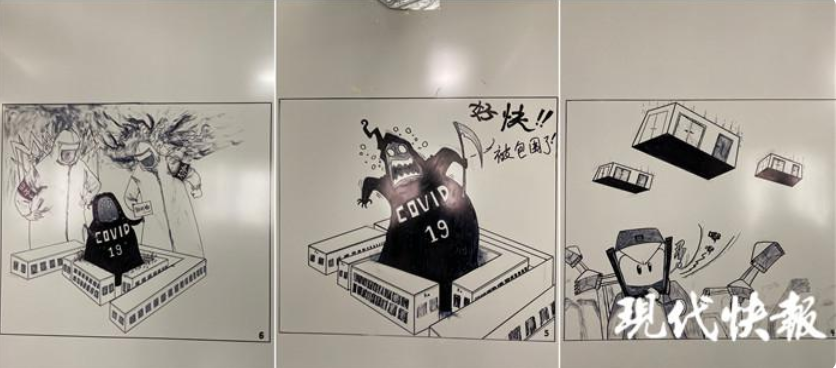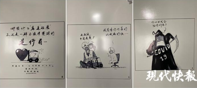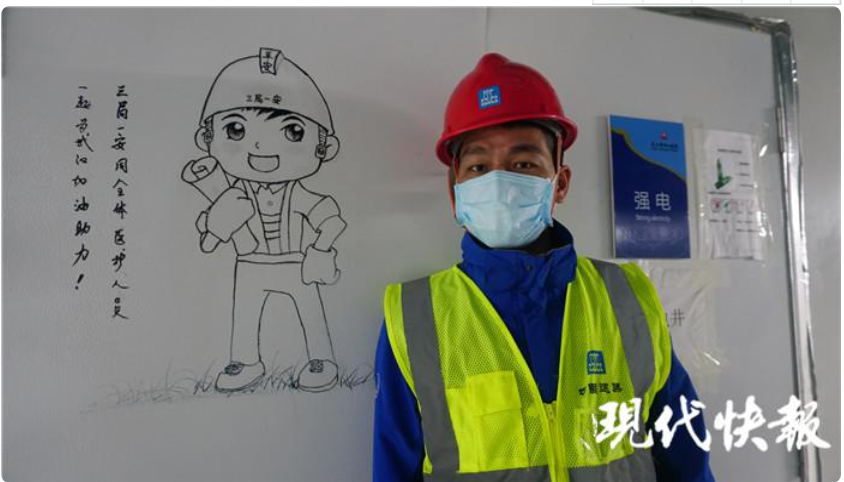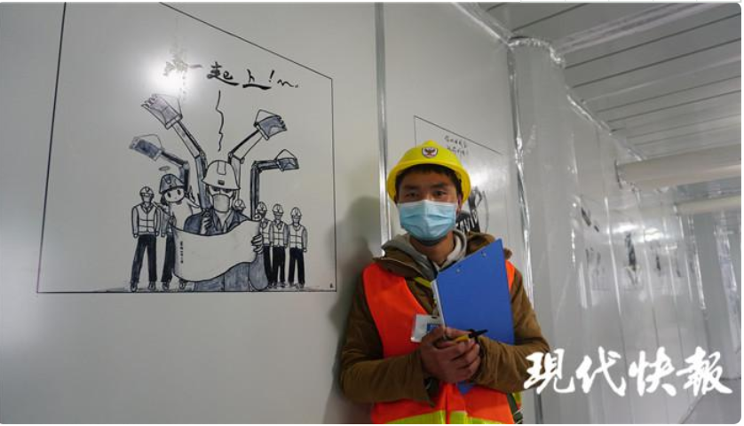 許新焰看到醫(yī)護(hù)人員通道的一面墻空著,就用一組漫畫,把中建三局建設(shè)醫(yī)院對(duì)抗 " 疫魔 " 的過程,用9幅漫畫體現(xiàn)出來。" 就是想給醫(yī)護(hù)人員、志愿者和我們這些維保隊(duì)員力量,我們用幾天時(shí)間就把醫(yī)院建起來了,這樣的速度,不怕疫魔。" 他說,每幅漫畫大約需要耗費(fèi)一兩個(gè)小時(shí),有時(shí)畫著畫著就要出工,前前后后花了七八天的時(shí)間,才把整組漫畫全部畫完。