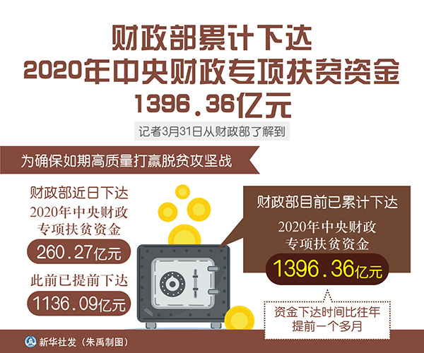 新華社北京3月31日電(記者申鋮)記者31日從財(cái)政部了解到,為確保如期高質(zhì)量打贏脫貧攻堅(jiān)戰(zhàn),財(cái)政部目前已累計(jì)下達(dá)2020年中央財(cái)政專項(xiàng)扶貧資金1396.36億元,資金下達(dá)時(shí)間比往年提前一個(gè)多月。