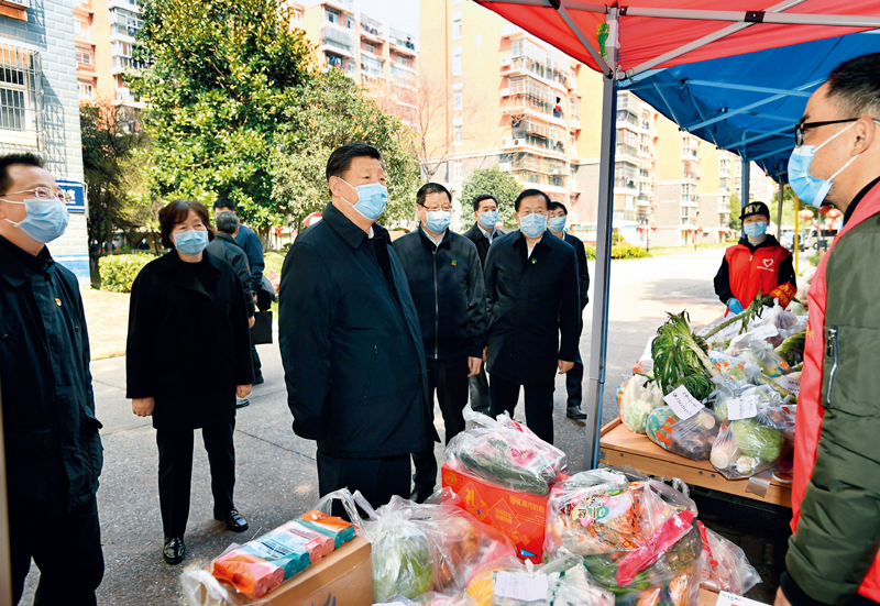 2020年3月10日,中共中央總書記、國(guó)家主席、中央軍委主席習(xí)近平專門赴湖北省武漢市考察新冠肺炎疫情防控工作。這是習(xí)近平在東湖新城社區(qū)生活物資集中配送點(diǎn),詳細(xì)詢問社區(qū)群眾生活物資采購(gòu)和供應(yīng)情況。 新華社記者 謝環(huán)馳/攝