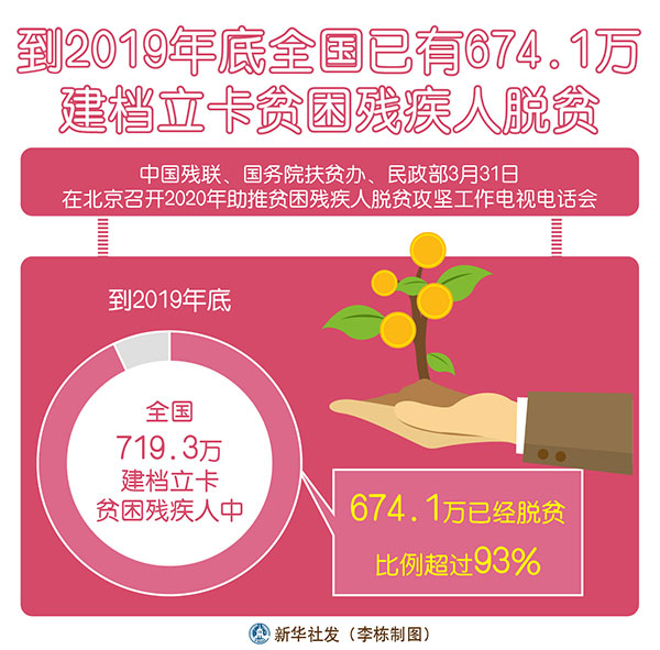 新華社北京3月31日電(記者孫少龍)中國殘聯(lián)、國務院扶貧辦、民政部31日在京召開2020年助推貧困殘疾人脫貧攻堅工作電視電話會。記者從會上了解到,到2019年底,全國719.3萬建檔立卡貧困殘疾人中,674.1萬已經(jīng)脫貧,比例超過93%。