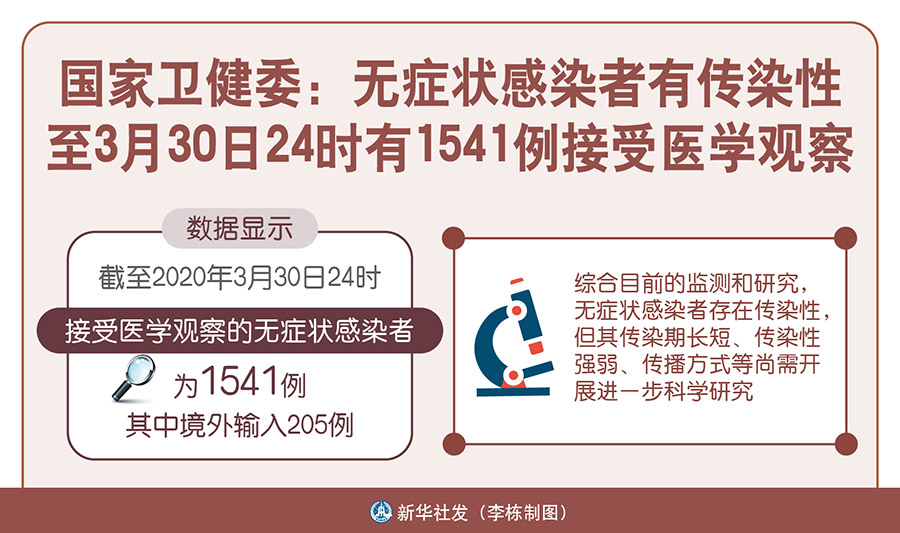 新華社北京3月31日電(記者王秉陽(yáng))國(guó)家衛(wèi)健委31日在官網(wǎng)發(fā)布《關(guān)于新型冠狀病毒無(wú)癥狀感染者的防控工作答問(wèn)》,對(duì)近來(lái)網(wǎng)民熱議的無(wú)癥狀感染者相關(guān)問(wèn)題進(jìn)行回答。數(shù)據(jù)顯示,截至2020年3月30日24時(shí),接受醫(yī)學(xué)觀察的無(wú)癥狀感染者為1541例,其中境外輸入205例。