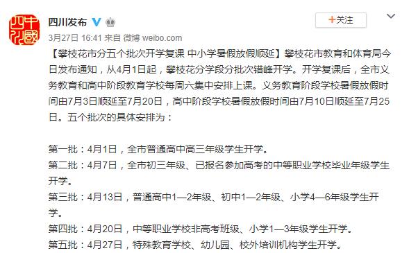 此外,四川攀枝花市教育和體育局近日也發(fā)布通知,從4月1日起,攀枝花分學(xué)段分批次錯峰開學(xué)。開學(xué)復(fù)課后,全市義務(wù)教育和高中階段教育學(xué)校每周六集中安排上課。義務(wù)教育階段學(xué)校暑假放假時間由7月3日順延至7月20日,高中階段學(xué)校暑假放假時間由7月10日順延至7月25日。