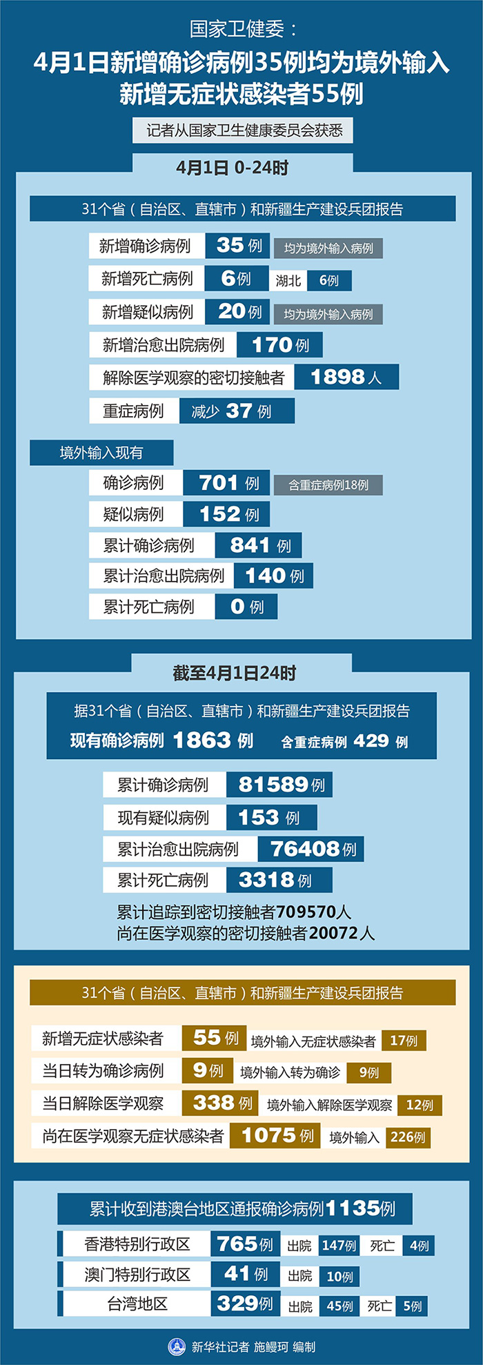 新華社北京4月2日電(記者王琦、田曉航)記者2日從國家衛(wèi)生健康委員會了解到,4月1日0-24時,31個?。ㄗ灾螀^(qū)、直轄市)和新疆生產(chǎn)建設(shè)兵團(tuán)報告新增確診病例35例,均為境外輸入病例;新增死亡病例6例(湖北6例);新增疑似病例20例,均為境外輸入病例。