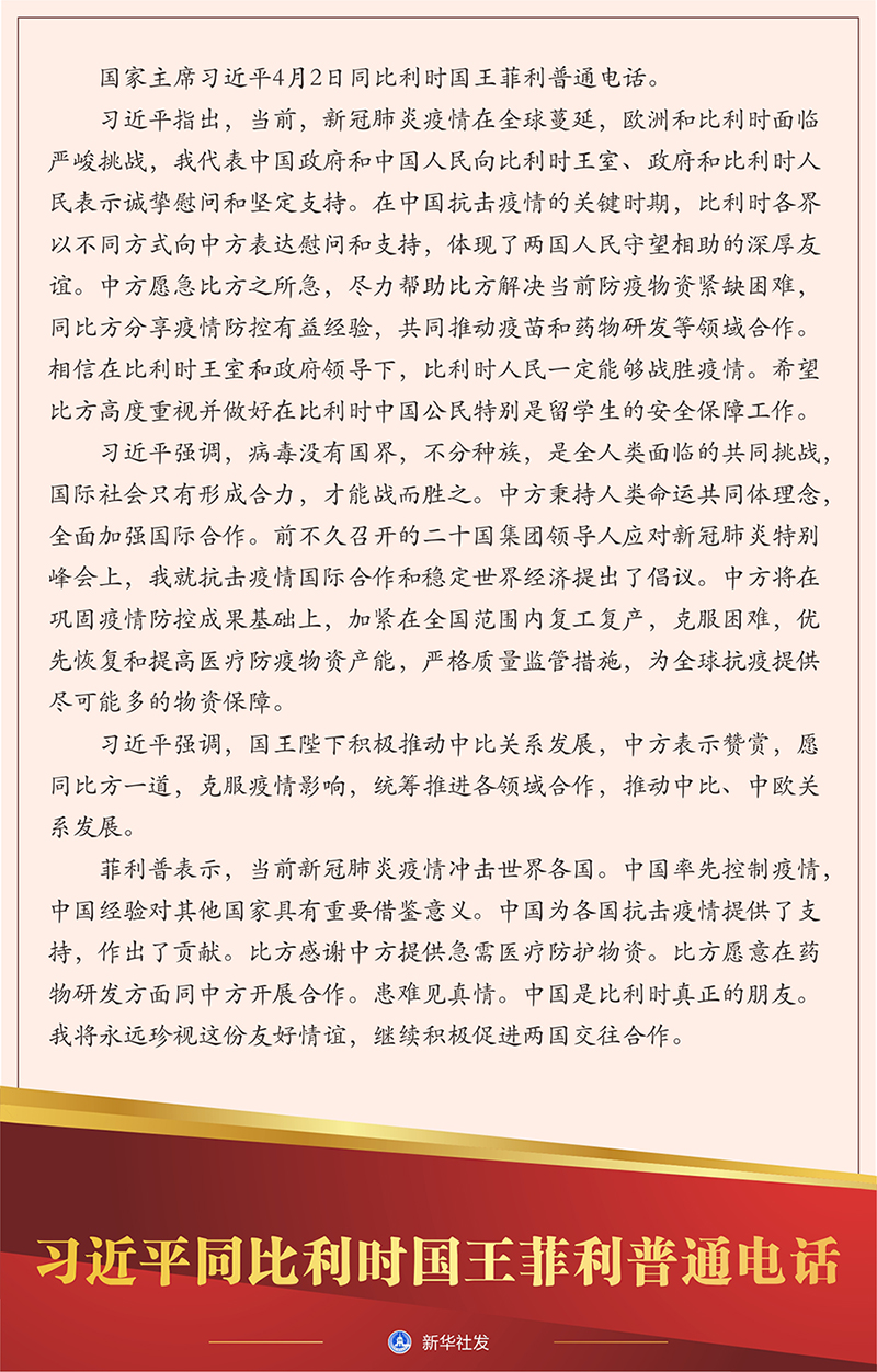 習(xí)近平指出,當(dāng)前,新冠肺炎疫情在全球蔓延,歐洲和比利時(shí)面臨嚴(yán)峻挑戰(zhàn),我代表中國政府和中國人民向比利時(shí)王室、政府和比利時(shí)人民表示誠摯慰問和堅(jiān)定支持。在中國抗擊疫情的關(guān)鍵時(shí)期,比利時(shí)各界以不同方式向中方表達(dá)慰問和支持,體現(xiàn)了兩國人民守望相助的深厚友誼。中方愿急比方之所急,盡力幫助比方解決當(dāng)前防疫物資緊缺困難,同比方分享疫情防控有益經(jīng)驗(yàn),共同推動(dòng)疫苗和藥物研發(fā)等領(lǐng)域合作。相信在比利時(shí)王室和政府領(lǐng)導(dǎo)下,比利時(shí)人民一定能夠戰(zhàn)勝疫情。希望比方高度重視并做好在比利時(shí)中國公民特別是留學(xué)生的安全保障工作。