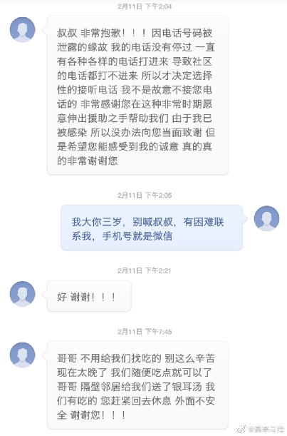 后來,老人每天打電話給所有跟他聯(lián)系過的志愿者,說需要什么物資。而當他們定期回訪其他求助者時,大部分人都會說,不需要幫助了,謝謝你們。樓威辰漸漸覺得老人自私貪婪,就不再接電話了。
