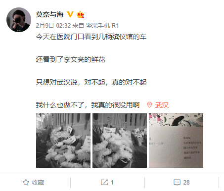 2月8日,他送一個紅會志愿者去武漢市中心醫(yī)院,給李文亮醫(yī)生獻花。他在醫(yī)院門口看到幾輛殯儀館的車,門診大門前堆滿了花束,連院外圍欄也放了一排鮮花在地上,每束花都有一個小紙條,寄托著同一種情緒。
