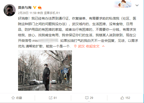 最近很少收到求助信息了。社區(qū)開始有限放行,市內(nèi)交通在逐步恢復,各行各業(yè)也在陸續(xù)復工。這意味著,武漢已經(jīng)不太需要他這樣的志愿者了。