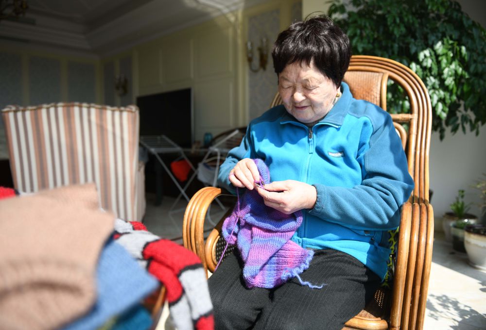 “毛衣奶奶”韓翠菊坐在陽臺上邊曬太陽邊織毛衣(2月21日攝)。新華社發(fā)