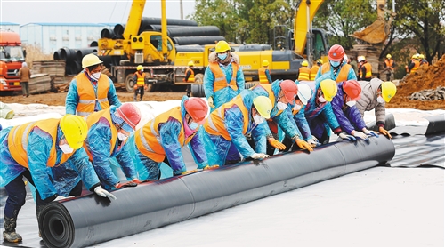 中建三局火神山醫(yī)院建設(shè)者在施工現(xiàn)場鋪設(shè)“兩布一膜”防護層。 (資料照片)