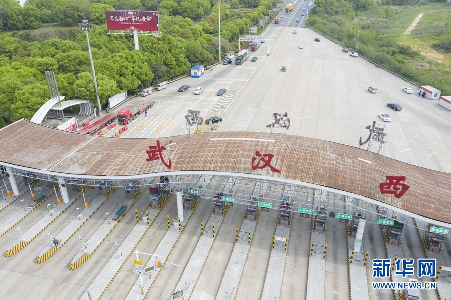 4月8日,車輛有序通過(guò)武漢西高速收費(fèi)站(無(wú)人機(jī)照片)。新華社記者 才揚(yáng) 攝