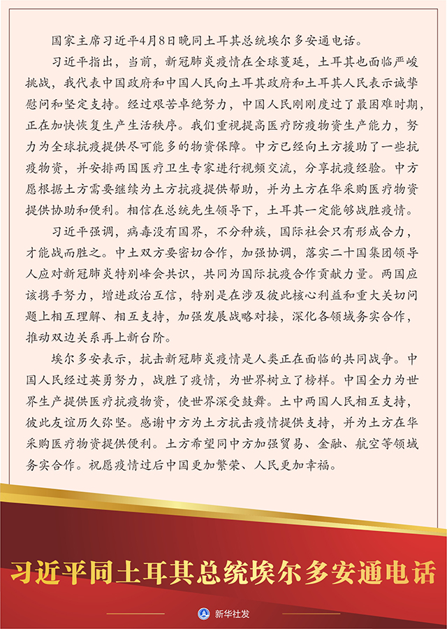 習(xí)近平指出,當(dāng)前,新冠肺炎疫情在全球蔓延,土耳其也面臨嚴(yán)峻挑戰(zhàn),我代表中國政府和中國人民向土耳其政府和土耳其人民表示誠摯慰問和堅(jiān)定支持。經(jīng)過艱苦卓絕努力,中國人民剛剛度過了最困難時(shí)期,正在加快恢復(fù)生產(chǎn)生活秩序。我們重視提高醫(yī)療防疫物資生產(chǎn)能力,努力為全球抗疫提供盡可能多的物資保障。中方已經(jīng)向土方援助了一些抗疫物資,并安排兩國醫(yī)療衛(wèi)生專家進(jìn)行視頻交流,分享抗疫經(jīng)驗(yàn)。中方愿根據(jù)土方需要繼續(xù)為土方抗疫提供幫助,并為土方在華采購醫(yī)療物資提供協(xié)助和便利。相信在總統(tǒng)先生領(lǐng)導(dǎo)下,土耳其一定能夠戰(zhàn)勝疫情。