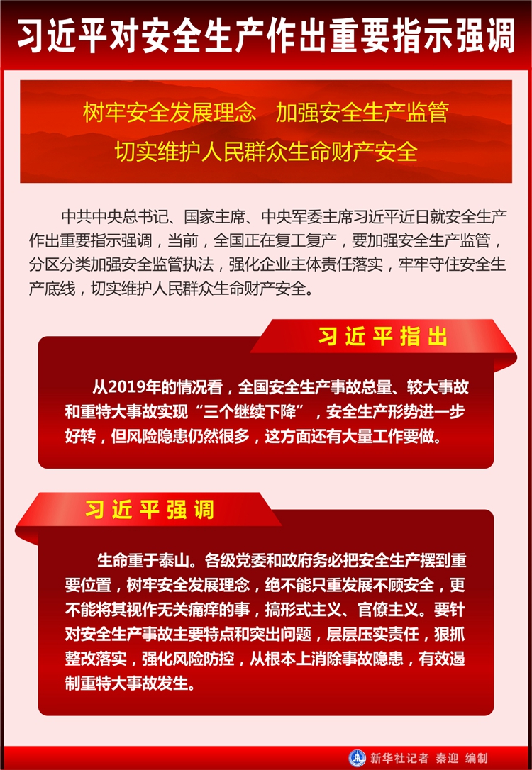 習近平強調(diào),生命重于泰山。各級黨委和政府務(wù)必把安全生產(chǎn)擺到重要位置,樹牢安全發(fā)展理念,絕不能只重發(fā)展不顧安全,更不能將其視作無關(guān)痛癢的事,搞形式主義、官僚主義。要針對安全生產(chǎn)事故主要特點和突出問題,層層壓實責任,狠抓整改落實,強化風險防控,從根本上消除事故隱患,有效遏制重特大事故發(fā)生。