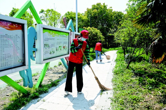 ▲4月9日,南潯區(qū)石淙鎮(zhèn)志愿者在花園灣村進行衛(wèi)生大掃除。?新華社記者黃宗治攝