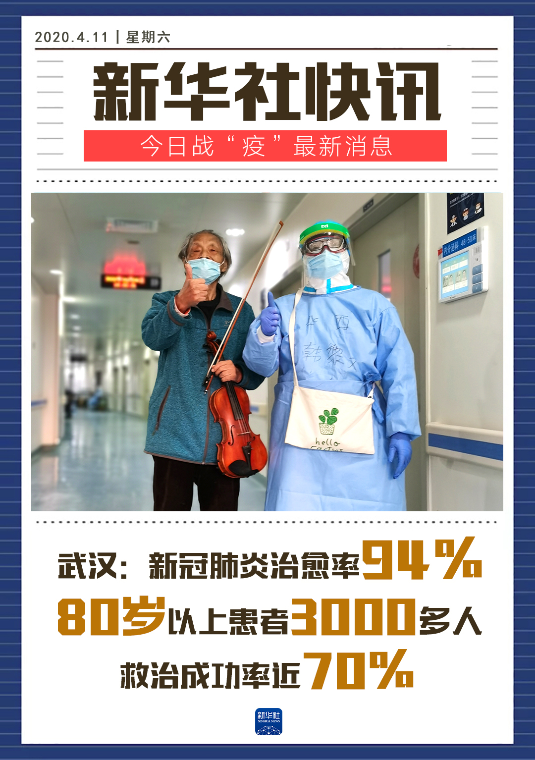 焦雅輝說,武漢新冠肺炎醫(yī)療救治總體治愈率達(dá)到94%,其中80歲高齡老人救治成功率近70%,這是非常難得的成果。在武漢新冠肺炎病例中,80歲以上的患者累計(jì)有3000多人,重癥發(fā)生率約40%。