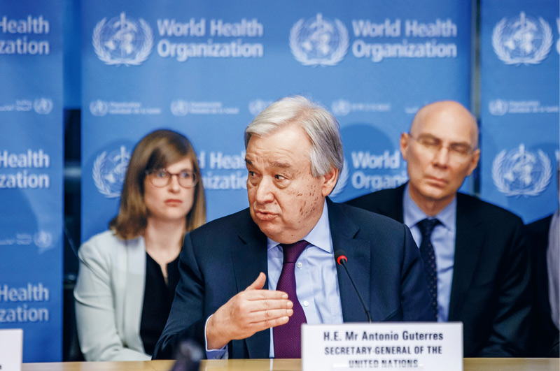 2020年2月24日,聯(lián)合國秘書長古特雷斯(前)在瑞士日內(nèi)瓦世界衛(wèi)生組織總部發(fā)表講話。古特雷斯表示,中國實(shí)施嚴(yán)格的防控措施,以犧牲正常生活的方式為全人類作出了貢獻(xiàn)。古特雷斯當(dāng)日造訪日內(nèi)瓦世衛(wèi)組織總部,并與世衛(wèi)組織各部門負(fù)責(zé)人舉行座談。 新華社發(fā)