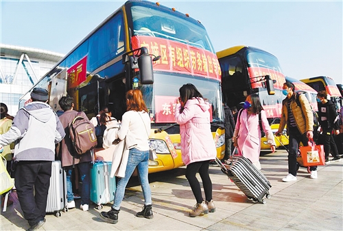 河南省南陽市宛城區(qū)組織務(wù)工人員乘坐大巴返崗。 陳 瓊攝