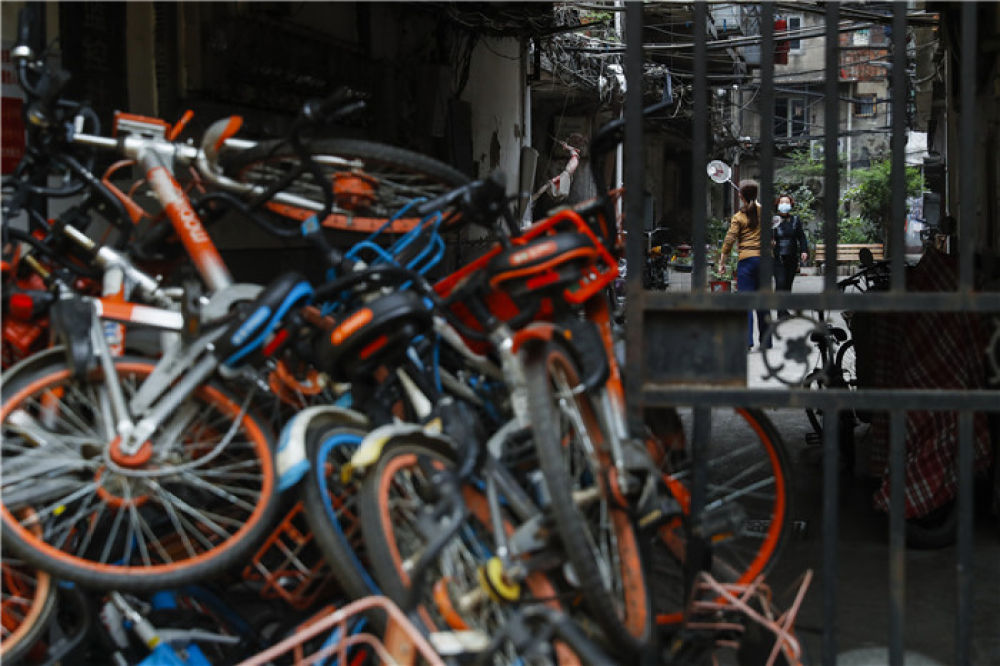 被共享單車擋住的小區(qū)柵欄門里
