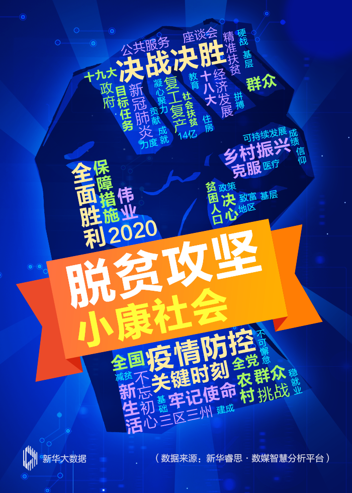 總書記的牽掛,也是網(wǎng)民的關(guān)注。新華睿思持續(xù)跟蹤微博、抖音、今日頭條等網(wǎng)上熱搜榜高熱話題,以及重大新聞事件,梳理出網(wǎng)民關(guān)注的熱詞集錦。根據(jù)關(guān)注度排行可以看出,“脫貧攻堅(jiān)”“小康社會(huì)”兩大關(guān)鍵詞位居前列,“決戰(zhàn)決勝”“全面勝利”“疫情防控”等也成為熱搜詞匯。