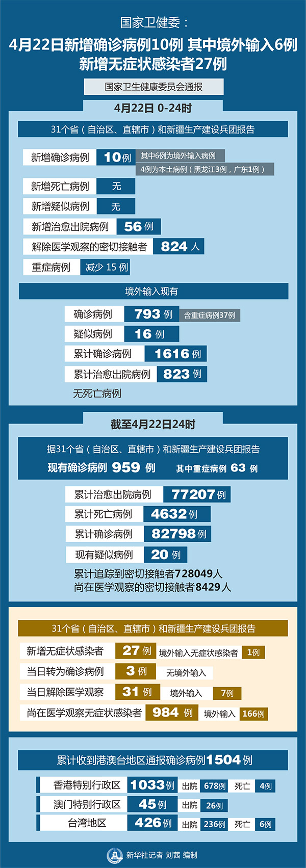 截至4月22日24時,據31個?。ㄗ灾螀^(qū)、直轄市)和新疆生產建設兵團報告,現(xiàn)有確診病例959例(其中重癥病例63例),累計治愈出院病例77207例,累計死亡病例4632例,累計報告確診病例82798例,現(xiàn)有疑似病例20例。累計追蹤到密切接觸者728049人,尚在醫(yī)學觀察的密切接觸者8429人。