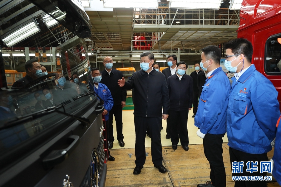 22日,習近平在西安考察復工復產和經濟社會恢復運行等情況。陜西汽車控股集團有限公司是西北地區(qū)有影響力的制造企業(yè)。習近平詳細了解產品研發(fā)、生產、銷售和復工復產情況,對他們克服疫情影響創(chuàng)產銷歷史新高表示贊賞??傃b車間內一片繁忙景象。習近平察看內飾生產線、總裝配生產線,饒有興致登上裝配完成的民用重型卡車駕駛室,向技術人員詢問產品性能和操作流程。習近平強調,制造業(yè)是國家經濟命脈所系。國有大型企業(yè)要發(fā)揮主力軍作用,在抓好常態(tài)化疫情防控的前提下,帶動上下游產業(yè)和中小企業(yè)全面復工復產。習近平指出,新時代陜西要有勇立潮頭、爭當時代弄潮兒的志向和氣魄,既要抓住西部大開發(fā)、共建“一帶一路”等重大機遇,又要善于從眼前的危機和挑戰(zhàn)中搶抓和創(chuàng)造機遇,不斷發(fā)展新模式、新業(yè)態(tài)、新技術、新產品,創(chuàng)造新的更大業(yè)績,邁上新的臺階。
