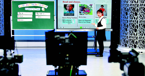 2月17日,寧夏銀川市金鳳區(qū)實(shí)驗(yàn)小學(xué)教師楊玉燕在錄制“空中課堂”四年級(jí)英語課程 馮開華攝