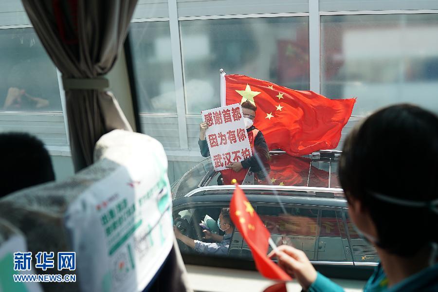 歡送的人群舉著橫幅——“感謝北京,因為有你,武漢不怕”“致敬最美逆行者”等標(biāo)語在陽光下閃動。