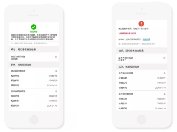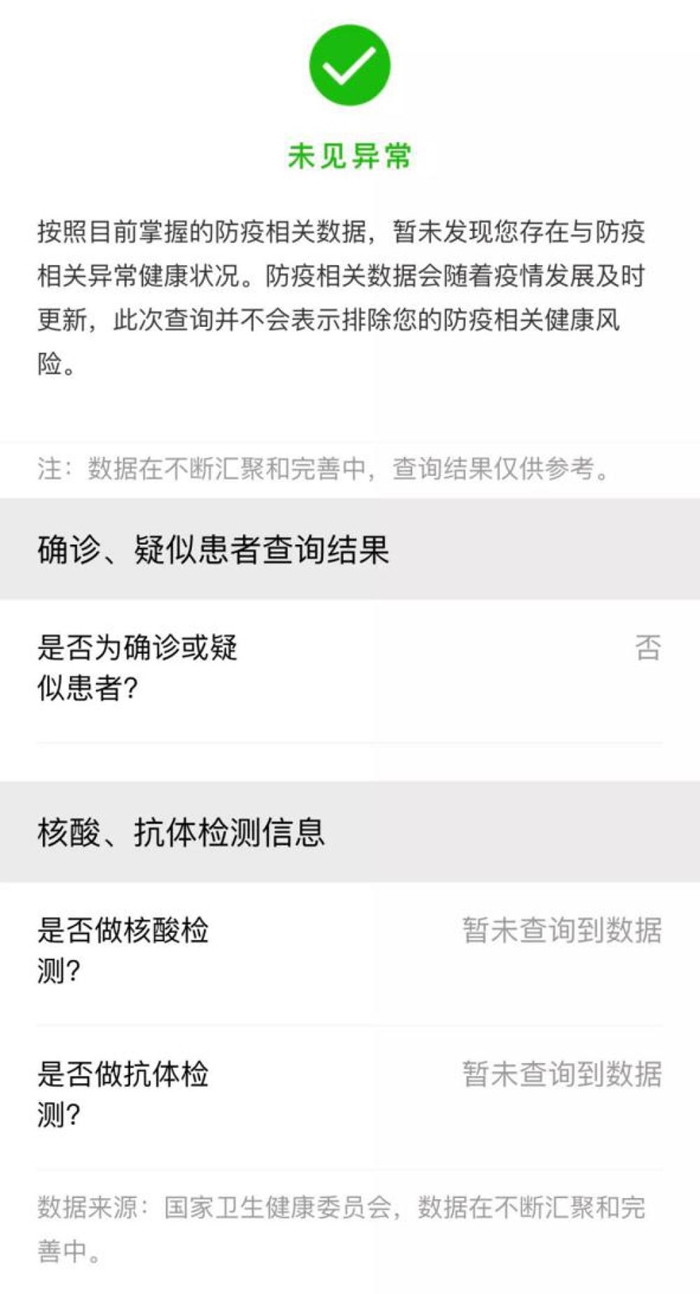 此外,核酸和抗體檢測結(jié)果信息還納入了全國一體化平臺“防疫健康信息碼”服務(wù)。用戶可通過國家政務(wù)服務(wù)平臺微信、支付寶、百度小程序,根據(jù)操作指引申領(lǐng)國家平臺的“防疫健康信息碼”,“防疫健康信息碼”會如實(shí)反映本人7天內(nèi)核酸及抗體檢測結(jié)果。如核酸檢測結(jié)果為陰性,則防疫健康風(fēng)險(xiǎn)狀態(tài)顯示“未見異?!薄H绾怂釞z測結(jié)果為陽性,則會出現(xiàn)“核酸檢測結(jié)果為陽性”的出行提示。如果7天內(nèi)未做過核酸及抗體檢測,防疫健康信息會根據(jù)個人當(dāng)前提供的相關(guān)數(shù)據(jù)顯示健康風(fēng)險(xiǎn)結(jié)果。