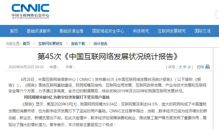《報告》顯示,截至2020年3月,我國網民規(guī)模為9.04億,互聯網普及率達64.5%,龐大的網民構成了中國蓬勃發(fā)展的消費市場,也為數字經濟發(fā)展打下了堅實的用戶基礎。CNNIC主任曾宇指出,當前,數字經濟已成為經濟增長的新動能,新業(yè)態(tài)、新模式層出不窮。在此次疫情中,數字經濟在保障消費和就業(yè)、推動復工復產等方面發(fā)揮了重要作用,展現出了強大的增長潛力。曾宇表示,本次報告主要呈現三個特點: