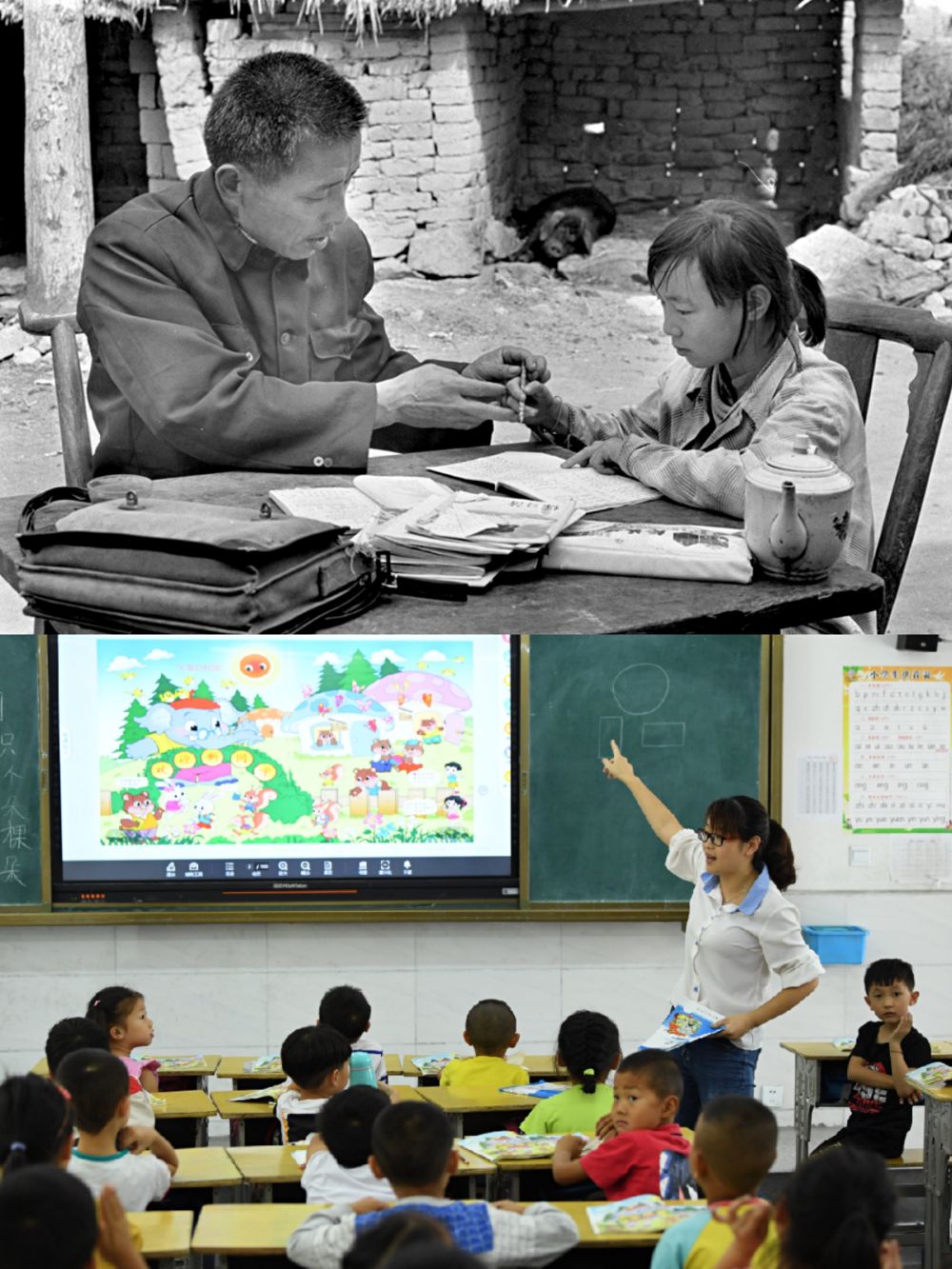 (上圖:1991年5月,金寨縣希望小學(xué)老師胡遵訓(xùn)跑20多里山路為學(xué)生胡亞麗補課,新華社記者張曙光攝;下圖:2019年9月3日,金寨縣希望小學(xué)南校區(qū)學(xué)生通過多媒體上課。新華社記者劉軍喜攝)
