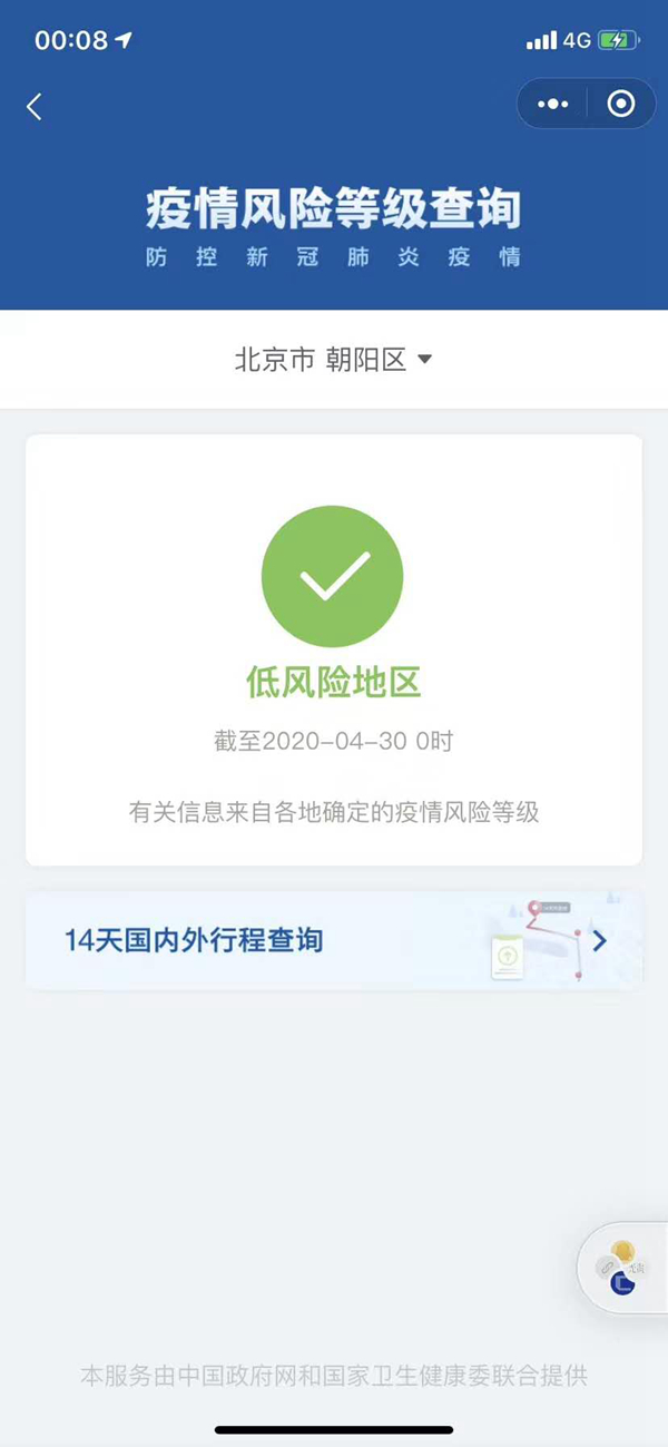 4月30日,疫情風(fēng)險(xiǎn)等級(jí)查詢系統(tǒng)顯示,北京朝陽區(qū)降為低風(fēng)險(xiǎn)地區(qū)。此前,朝陽區(qū)為全國(guó)唯一高風(fēng)險(xiǎn)地區(qū)。4月29日 ,北京市宣布4月30日起公共衛(wèi)生應(yīng)急響應(yīng)級(jí)別由一級(jí)降至二級(jí)。(李金磊)