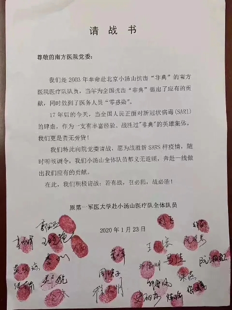 △1月23日,曾參加原第一軍醫(yī)大學(xué)赴小湯山醫(yī)療隊的南方醫(yī)院24名醫(yī)護(hù)人員寫下請戰(zhàn)書,主動要求赴一線工作。