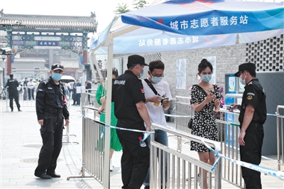 昨日,游客逛南鑼鼓巷前需要出示預(yù)約碼以及檢測(cè)體溫合格。新京報(bào)記者 王嘉寧 攝