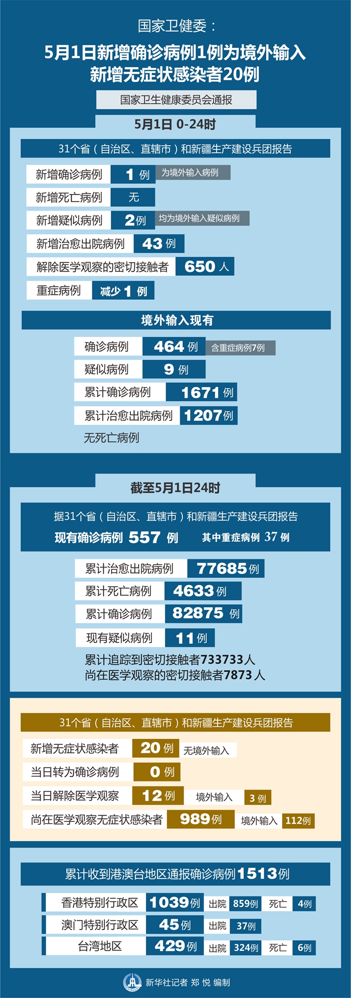 圖表:國(guó)家衛(wèi)健委:5月1日新增確診病例1例為境外輸入,新增無(wú)癥狀感染者20例 新華社記者 鄭悅 編制