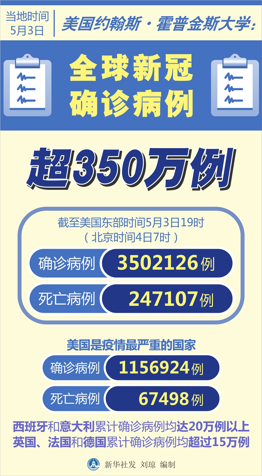 新華社紐約5月3日電 美國約翰斯·霍普金斯大學3日發(fā)布的新冠疫情最新統(tǒng)計數(shù)據(jù)顯示,全球累計確診病例超過350萬例。